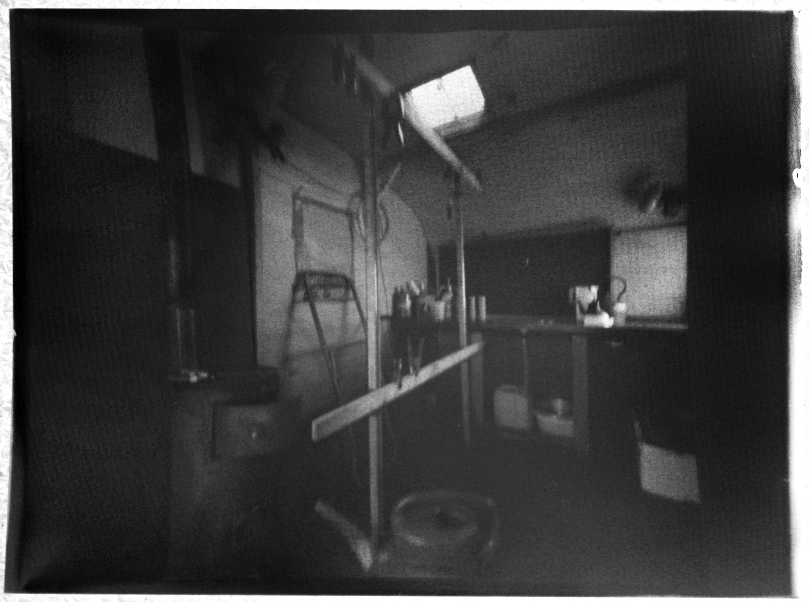 The Mobile Pinhole Laboratory is a kingsize pinhole camera. It is developed for experiments on very large format paper negatives. I use PE & baryta paper, negative & direct positive. Roll paper & paper sheets. Really anything I can get my hand on. I try to work as simple & basic as possible. The camera also functions as darkroom , laboratory & shelter.